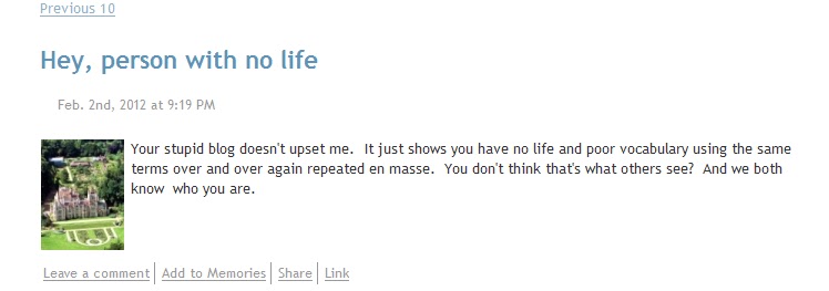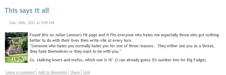 Oh she found another person's blog or journal! Please note that Catshit will go looking for anything about her on the internet. She is that dedicated to stalking people who might say something she doesn't like!